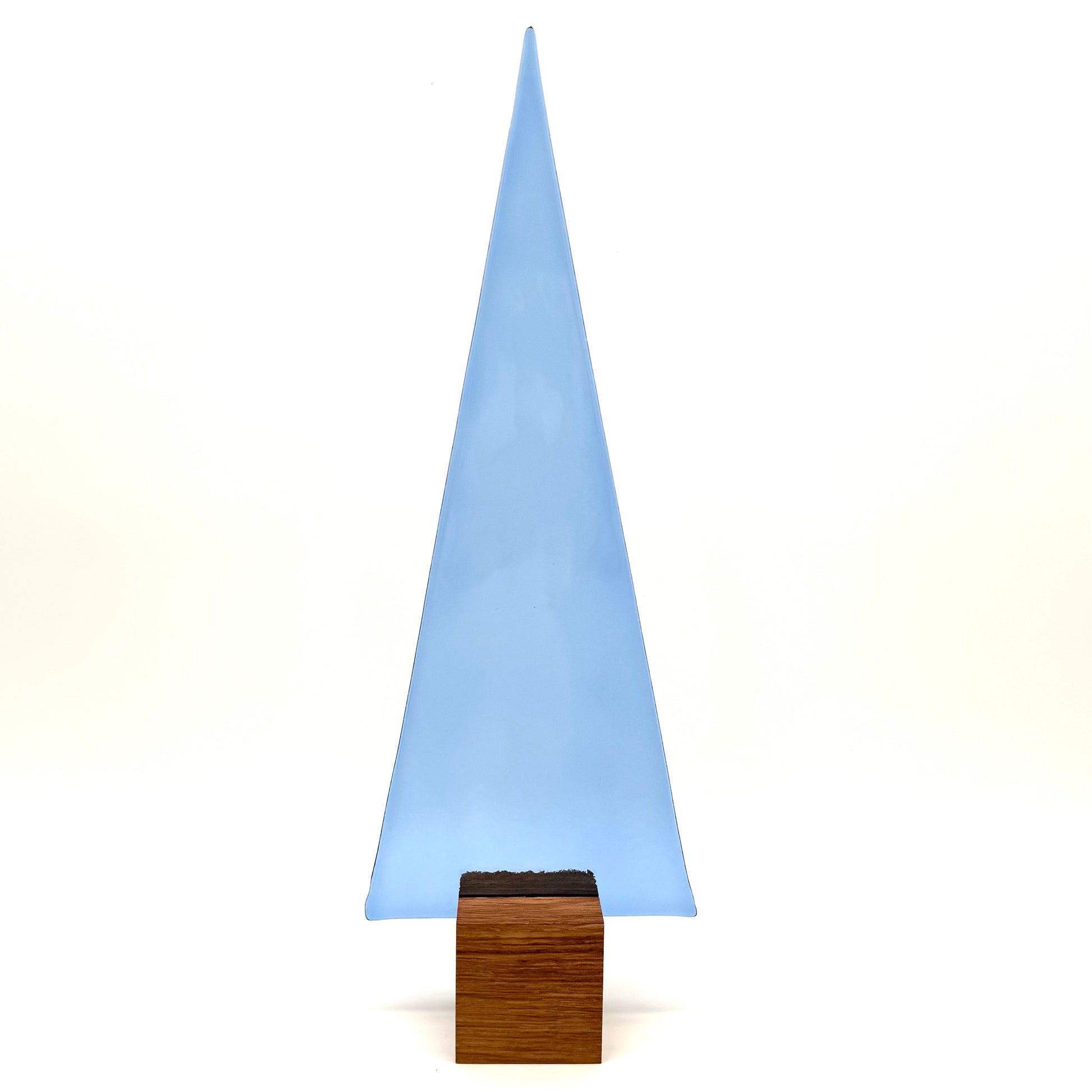 Ein großer hellblauer Glasbaum, handgefertigt und auf hochwertigem Eichenholz montiert. Mit ca. 33 cm Höhe ist dieser Glasbaum ein beeindruckendes Dekorationsstück, das durch seine sanfte himmelblaue Farbe und Größe besticht.