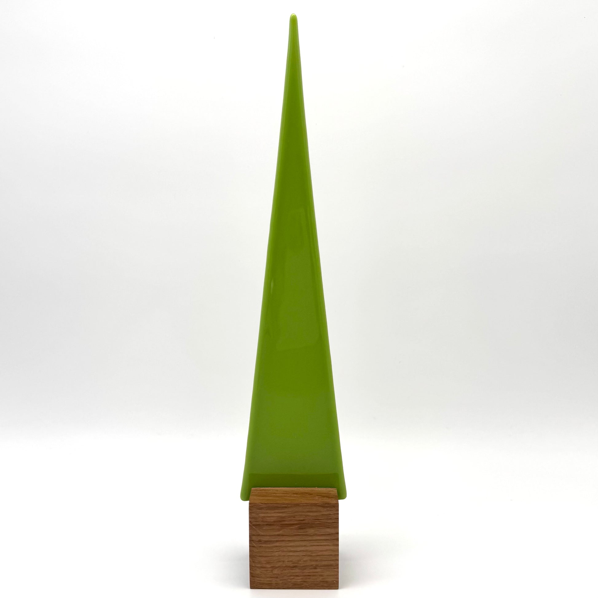 Ein eleganter hellgrüner, nicht durchsichtiger Glasbaum, handgefertigt und auf hochwertigem Eichenholz montiert. Mit ca. 31 cm Höhe ist dieser Glasbaum ein stilvolles Dekorationsstück, das durch seine matte, opake Oberfläche besticht.