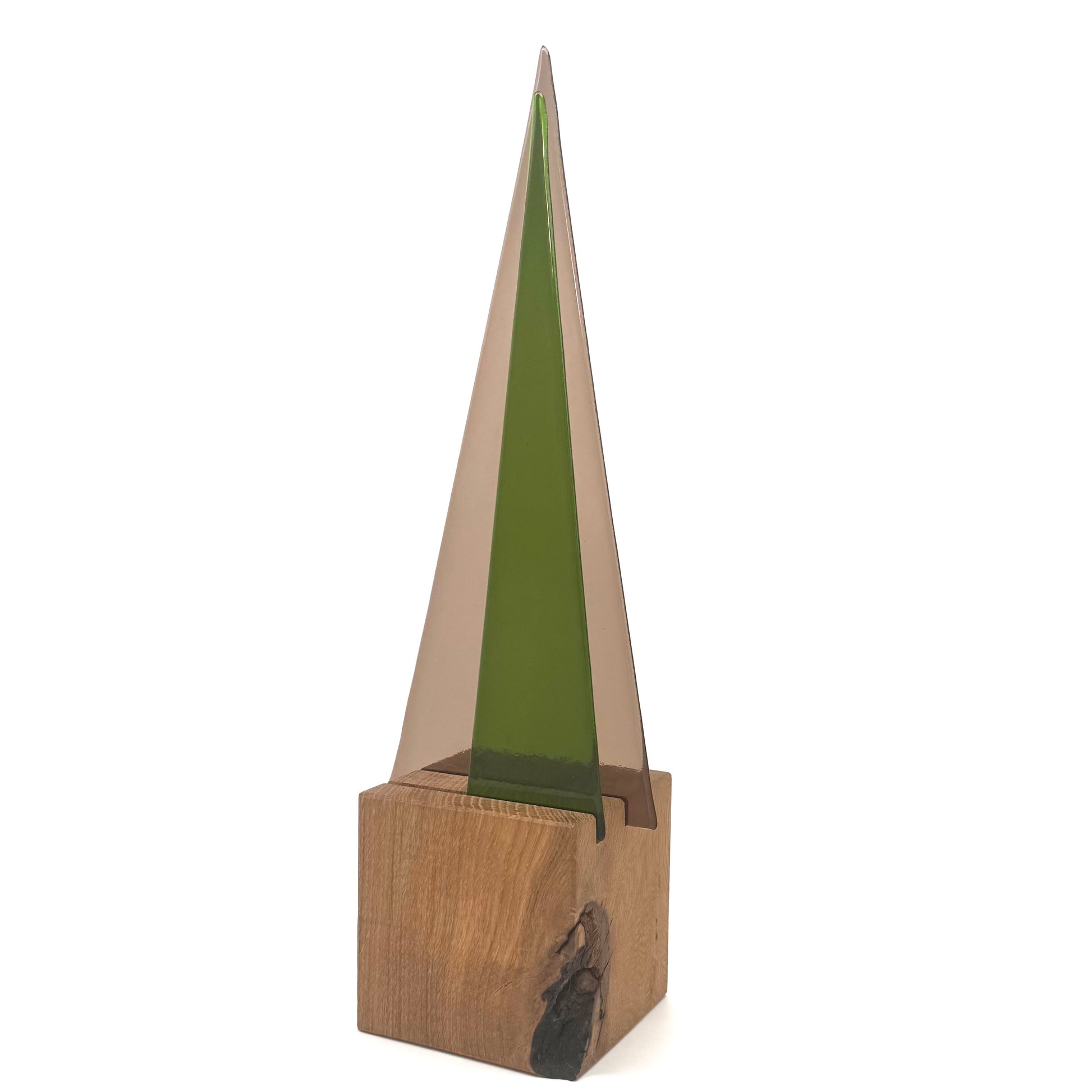 L991 Glasbaum-Duo taupe + moosgrün auf Eiche - 39 cm hoch, 13 cm breit